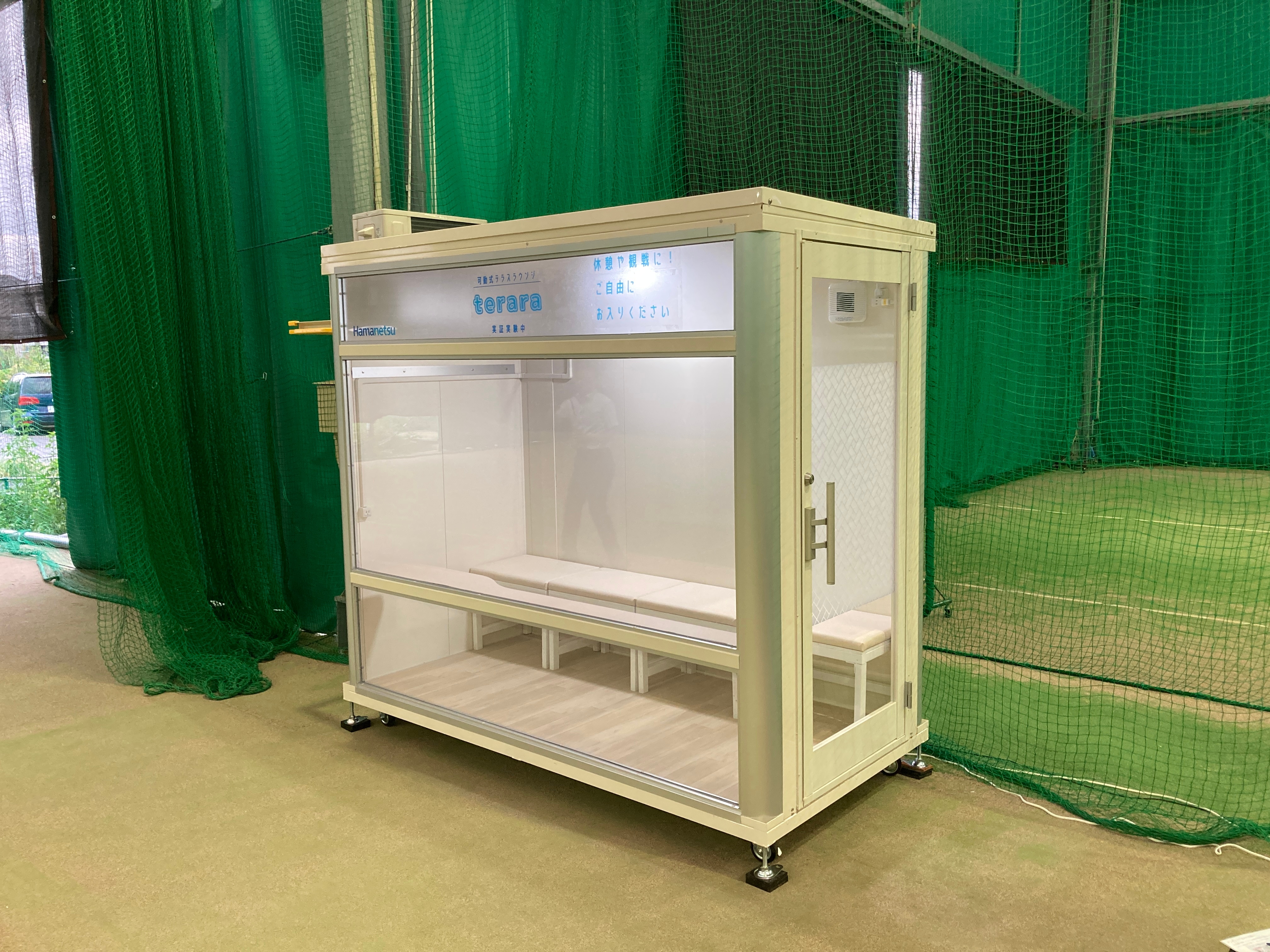 半屋内ですが、夏は暑く冬は寒くなる場所なので、この度試験使用をいたしました。スクール生、クラブ会員が休憩時間によく使用されていて、プレイ中のクールダウンにちょうどいいとのお声をいただいています。 スクール生のお子さんの親御さんが中に入って見学することもあり、前面が大きなガラス張りになっているので、コートと一体感があると、とても好評です。